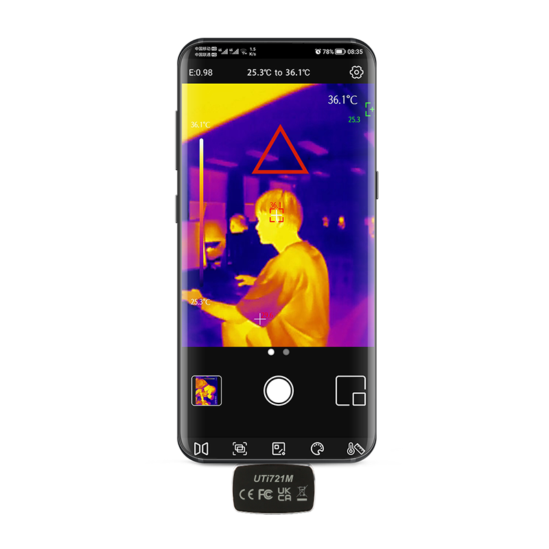 UTi721M is a professional thermal camera module for smartphones, which is compact, portable, and easy to operate through connecting with mobile phones. It’s 256×192 IR resolution provides clear image with a fast response.UTi721M is with wide temperature measurement range -20℃ ~ 550℃.It includes two measurements modes for elevated skin temperature inspection and industry applications. Users can troubleshoot HVAC problems or investigate heat source issues around the house and hidden issues faster and easier with this thermal camera module. It is a perfect tool for DIY homeowners,outdoor lovers, engineers, contractors and builders etc.