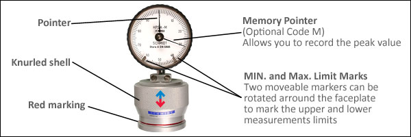 - The spring loaded outer ring assures a constant measuring pressure and eliminates false readings due to difference between operators.