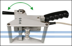Swivel the lever of tension meter KXE in direction to the handle to move the reference frame with the support rollers upwards. Hold the measuring head over the yarn group, so that it runs parallel to the measuring feeler and the support rollers. Shove the measuring roller through the yarn group, turn the measuring head by 90° and swivel the lever forward.