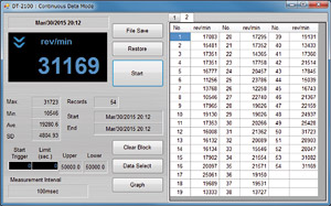 - Hand-held tachometer DT-2100 can be set for single point or continuous logging. Data points, as well as statistics (MIN, MAX, AVG) can be stored and recalled to the display