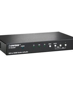 1T-VS-647 SDI to HDMI Scaler with Audio converts a variety of SDI transmission rates and video resolutions into an HDMI signal. It also provides audio flexibility by outputting the audio embedded in the SDI signal to external connectors (both analog and digital formats) for distribution separate from the HDMI data stream. Bit rates to 2.970Gb/s allow processing of resolutions up to and including 1080p. SMPTE standards 425 A&B, 424M, 292M & 259M-C are supported and SMPTE 425M level B to level A Conversion is also standard. Automatic Input Video Format Detection and an On Screen Menu display make operation easy and intuitive. Additional capabilities include SDI loop-thru with equalization and reclocking which means the 1T-VS-647 SDI to HDMI Scaler doubles as an SDI repeater. Finally, as part of the SDI to HDMI scaling process, SDI timing is automatically converted to PC timing parameters.