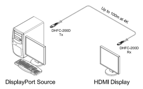 Detachable DisplayPort 1.2 to HDMI 2.0 converting active optical cable, DHFC-200D, enables to convert DisplayPort 1.2 signal to HDMI 2.0 signal, and extends 4K (4096×2160) at 60Hz up to 100m (328feet) over plenum graded (or LSZH) hybrid cable. It avoids any scaling or data compression for lessening a burden of data transmission.