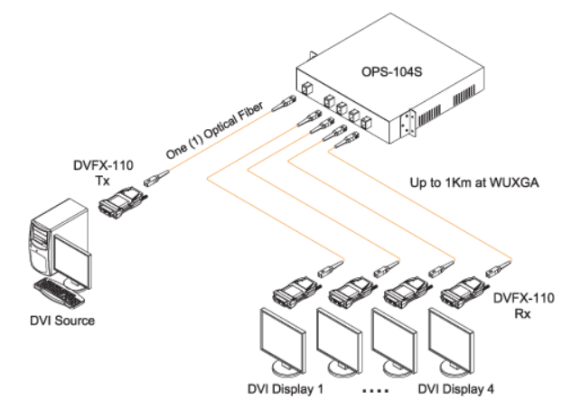 DVFX-110-TR is capable of driving uncompressed WUXGA (1920×1200) 60Hz DVI signal up to 1,500m (4920feet) over one (1) SC single-mode or 500m (1640feet) over one (1) SC multi-mode fiber. The key features of DVFX-110-TR is, by using an optical passive splitter (OPS-116S), one (1) signal from transmitter can be copied up to 16 different displays and it gives you a cost effective and space saving installation for various application.
