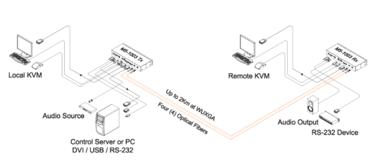 M5-1003-TR offers extremely long extension of DVI, USB, serial control data and audio up to 2,000m (6560feet) over single-mode and 500m (1640feet) over multi-mode fibers with a pair of duplex LC connectors. It is tremendously long over the limits of copper extensions like a few of meter of DVI and USB.