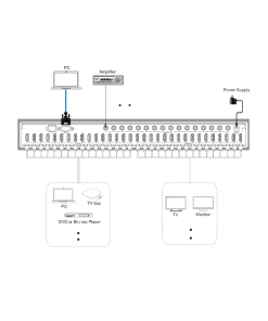 The 18Gbps 16×16 HDMI Matrix supports the transmission of video (resolution up to 4K2K@ 60Hz YUV 4:4:4) and multi-channel high resolution digital audio from 16 HDMI sources to 16 HDMI displays. Audio de-embedded to coaxial audio is supported from 16 HDMI output ports. While HDMI output ARC function is enabled, the ARC audio from HDMI display devices will be extracted to coaxial audio output. Each HDMI output of this 16×16 HDMI Matrix supports 4K2K to 1080P downscaler independently. Control via front panel buttons, IR remote, RS-232, LAN and Web GUI.