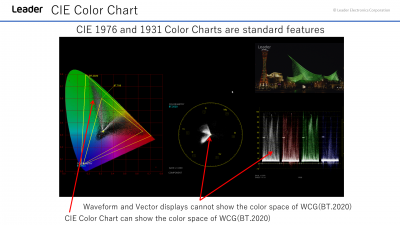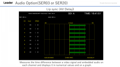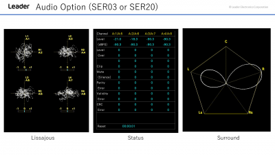 The waveform, vector, picture, audio, and eye pattern displays enable simple yet comprehensive measurements and quality control of the widest range of audio and video formats. The status display allows you to assess errors and system stability with both event logs and long-term charts. Audio embedded in SDI signals can be shown on the level, Lissajous, and status displays.