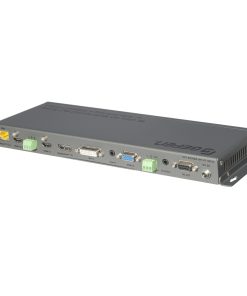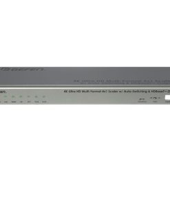 The Gefen EXT-4K300A-MF-41-HBTLS is a 4×1 Presentation Switcher with HDMI, DisplayPort, DVI, and VGA inputs, along with an L/R analog audio input that accompanies both the DVI and VGA inputs. It features split HDMI/HDBaseT outputs, and a de-embedded analog L/R audio output. The 4 inputs can be switched automatically or manually. Control options include the front panel, a hand-held IR remote, electrical IR, RS-232, and contact closure. The split HDMI and HDBaseT outputs can simultaneously feed a local and a remotely-installed display, adding flexibility in larger presentation environments.