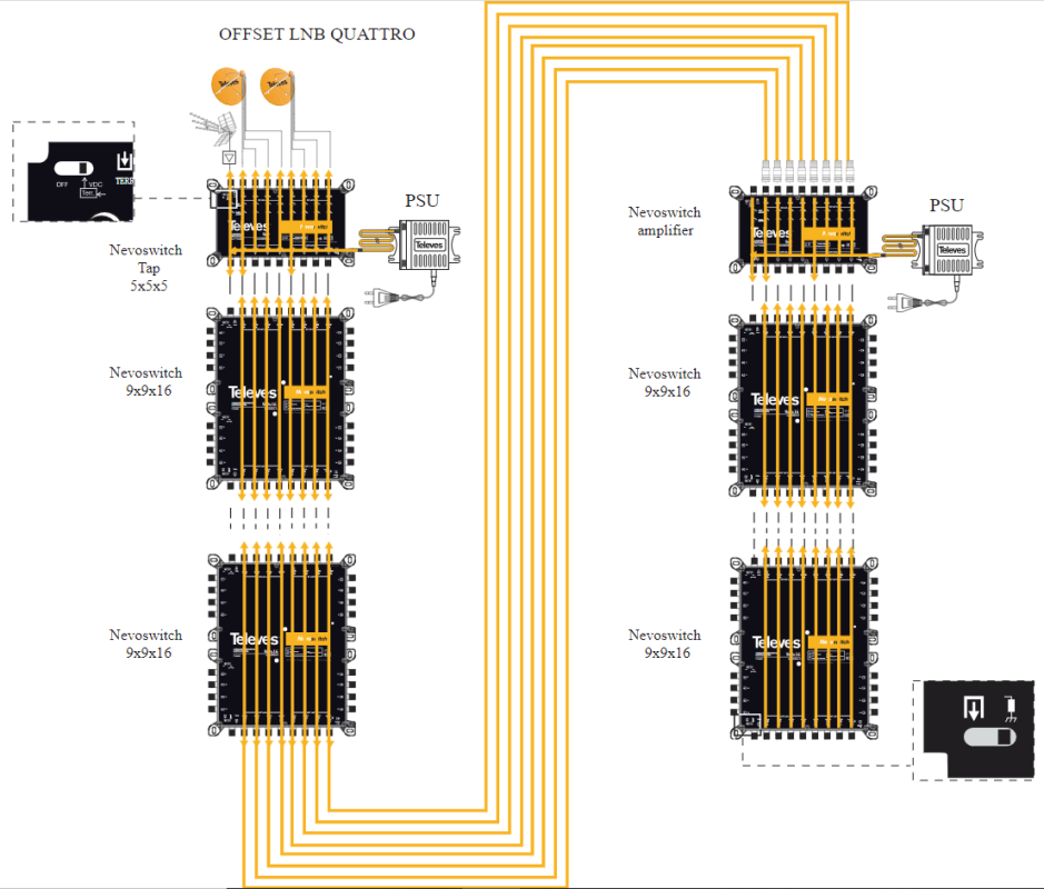 - 10 dB Low Gain (LG) / High Gain (HG) switch for the attenuation of the satellite input signal for each 8-user group