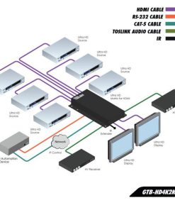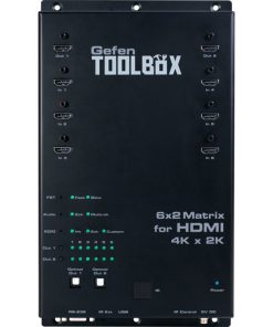 The Gefen GTB-HD4K2K-642-BLK ToolBox 6×2 Matrix for HDMI is a compact and lightweight alternative to rack-mounted matrixes. It allows up to six Ultra High Definition 4K or 1080p Full HD sources to be routed to up to two Ultra HD displays. Each Hi-Def source can be routed to either of the connected displays using the front panel push-button controls, the included IR remote, RS-232 serial control interface, or through IP, using Telnet, UDP, and the built-in web server interface. LED indicators on the top panel display the current routing status, FST mode, audio configuration, and EDID settings.