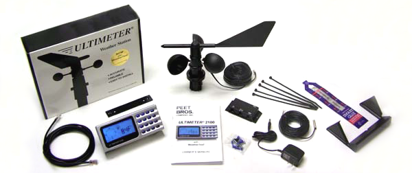 ULTIMETER® 2100 – best in its class! The much-anticipated successor to our most popular weather station ever (the ULTIMETER 2000, world-renowned standard for performance and reliability in a home weather station), the ULTIMETER 2100 features a stunning platinum-tone housing with brilliant blue display backlighting. To improve the user interface still further, an illuminated keypad provides exceptional visibility in darkness or low-light conditions. The ULTIMETER 2100 utilizes Peet Bros.’ patented and proven weather sensor technology, including our unique all-digital wind sensor, incomparable ULTIMETER PRO Anemometer, featuring exceptional response in all wind conditions, including very low wind speeds (typical starting threshold 1.5 mph! here’s why). It also features direct serial data output including WeatherText®, and is APRS-ready. And it offers the unsurpassed performance and reliability of cabled sensors – the professional’s choice (see Why are cabled sensors better?) It has all the features of its predecessors – all the features you’ve asked us for – and a few you might not have thought of. Its microprocessor is 8 TIMES FASTER and has 4 TIMES THE MEMORY of our earlier weather stations. Here’s what it does with all that power: